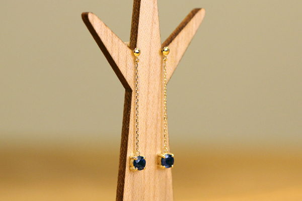 こちらは、先日お納めしたピアスです。 揺れるタイプで、かつシンプルなデザインをご希望。 K18イエローゴールドで仕立てました。 チェーンにはカットが入っていて、 揺れると石とともに光を受けて、きらりと輝きます。