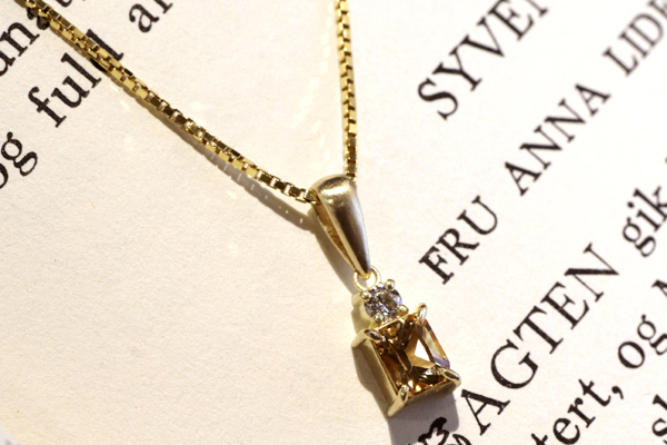 こちらは、K様よりオーダーいただきましたペンダントです。 本日納品をさせていただきました。 数ヶ月前にご来店くださった際にインペリアルトパーズのルース(裸石)をご覧いただきましたところ、 エメラルドカットの形や色味などをとても気に入ってくださり、ダイヤモンドを添えてペンダントにとオーダーいただいておりました。