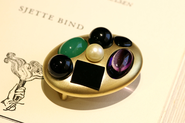こちらは、T様よりオーダーいただいておりました帯留め。 いくつかのジュエリーやルース(裸石)をお持ちいただきまして、それらの宝石を集めて帯留めに仕立てたいとのご要望でした。