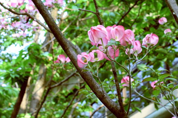 近くの小学校のハナミズキ。 青い空にピンクの花(本当は“葉”だとか)が、きれいです。