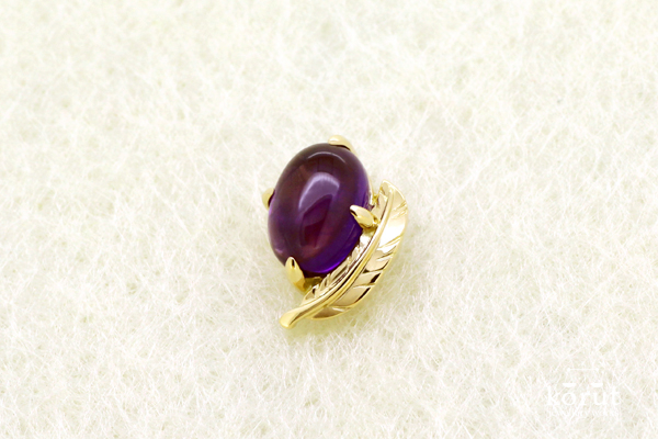 明日は七夕ですね。 2日ほど前に近所を歩いていると、手に笹を持った子どもたちを何度か見かけました。 幼稚園などで配っているのでしょうか。 どんな願いごとをするのか、ちょっと覗いてみたくなりました。 さて、本日ご紹介するのは少し前にお納めしたタイタック。 カボションカット(ドーム型のカット)のアメシストに、羽根をあしらいました。 「はね」をモチーフにする場合、翼なのか羽根なのか、またそのデザインの仕方によって、ずいぶん印象が変わります。