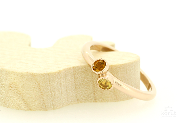 こちらは店頭でご覧になったコロットオリジナルのリングを元にお客様からのご依頼でお作りしたリング。 お客様のご希望に合わせて、金属は18金ピンクゴールドを使用し、石は濃淡のシトリンを組み合わせました。 2つの宝石と、金属の種類、ツヤ消しの有無など、組み合わせ次第で様々な表情が見られるリングだと思います。