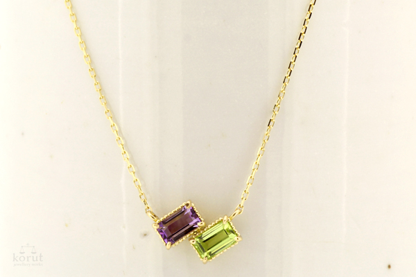 アメジストとペリドットのペンダント。 アシンメトリーな2石の配置が印象的な仕上がりに。 18金イエローゴールドと同系色のペリドットに、反対色のアメジストが良いアクセントになっています。 こちらの石枠を使った1石バーションのペンダントは店頭でも販売させていただいているのですが、2石の組み合わせも素敵ですね。