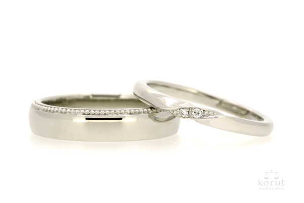 こちらは先日お納めしました、M様とI様のマリッジリング。 幅広の男性用リングは、片側のエッジにミル(粒々)のアクセントを。 女性用リングは、ねじり風の加工を施した部分にダイヤモンドをあしらいました。 どちらもプラチナでお作りし、ストレートラインのリングですが、デザインにはそれぞれのお好みを取り入れました。