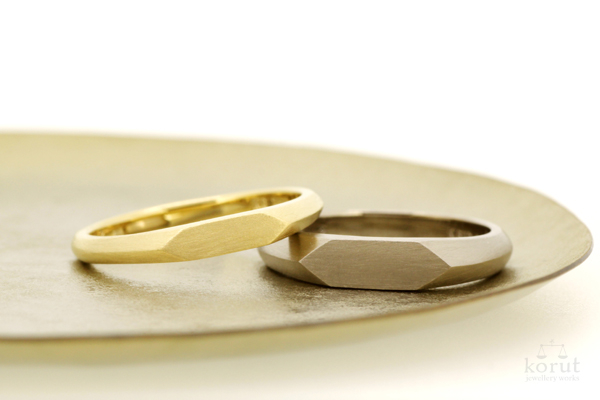 こちらは、少し前にお納めしたマリッジリング。 ゆるやかなカーブを描くリングのフォルムに合わせて、左右に傾斜をつけました。 センター部分は少しシャープなエッジを出してヘアライン加工を施し、女性用リングにはダイヤモンドを。 光沢とヘアラインのプラチナの質感の違いが、程よいアクセントになっています。